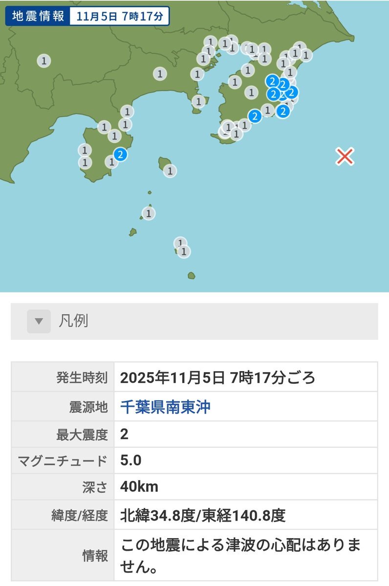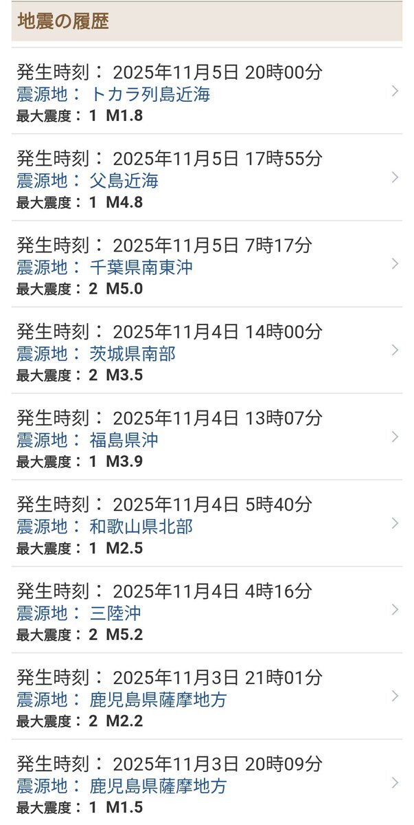 2025年11月5日(水) 鹿児島県薩摩地方で2日夜から3日にかけて連続した地震はピタッと止まってる 「地中の断層などのずれによる構造性の地震によるものだとしています(鹿児地方気象台)」 一方東日本で4日茨城県南部や5日最大震度2で体感し難いのに千葉県南東沖のマグニチュード5.0 こういうのは気になる pic.x.com/WAmquoSq8Q x.com/vso_osv/status…