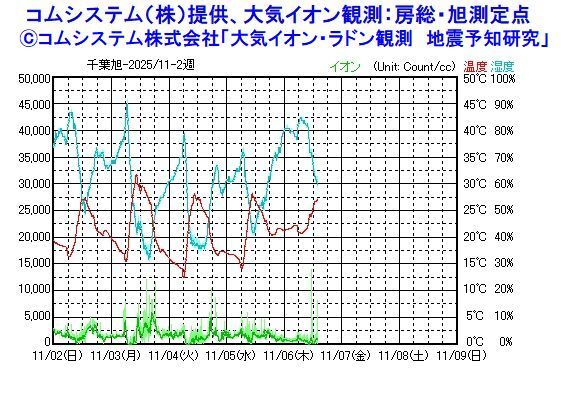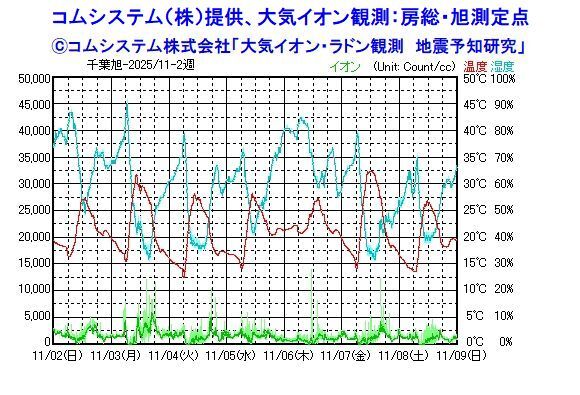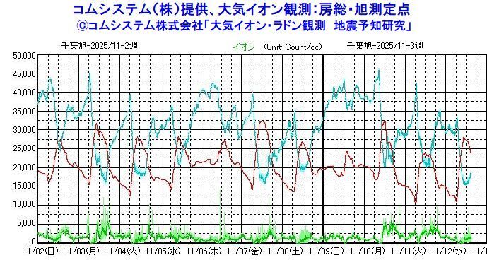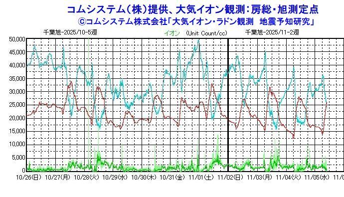 【要警戒継続】コムシステム(株)提供、大気イオン観測:房総・旭測定点 26日3500;27日5000;28日スケールアウト;29日、30日10000;31日12500;11月01日13500;02日5000;03日12500;04日10000;05日6000(個/cc)減衰傾向。 茨城県南部、千葉県北東部、千葉県東方沖付近を中心に注意継続 pic.x.com/VrPlRQwEjD