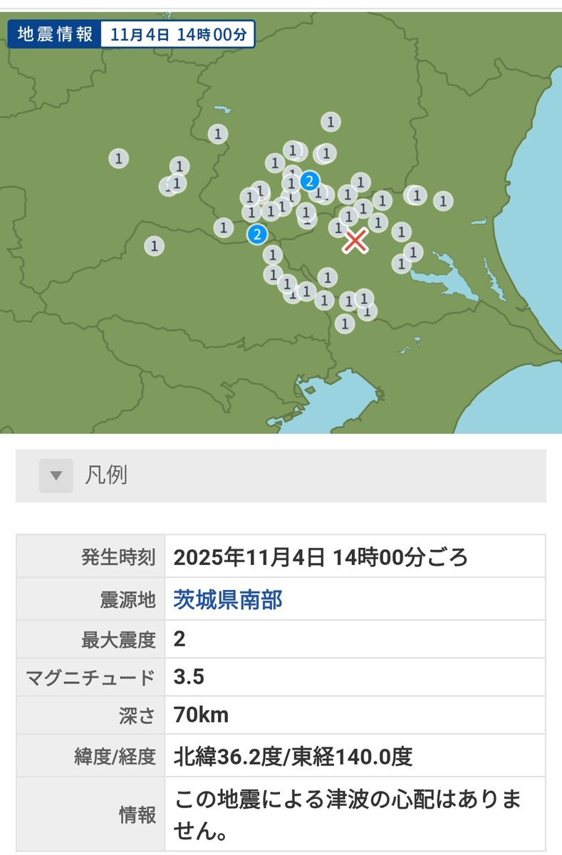 地震情報(2025年11月4日)最大震度2|震源地:茨城県南部 - Yahoo!天気・災害 typhoon.yahoo.co.jp/weather/jp/ear…