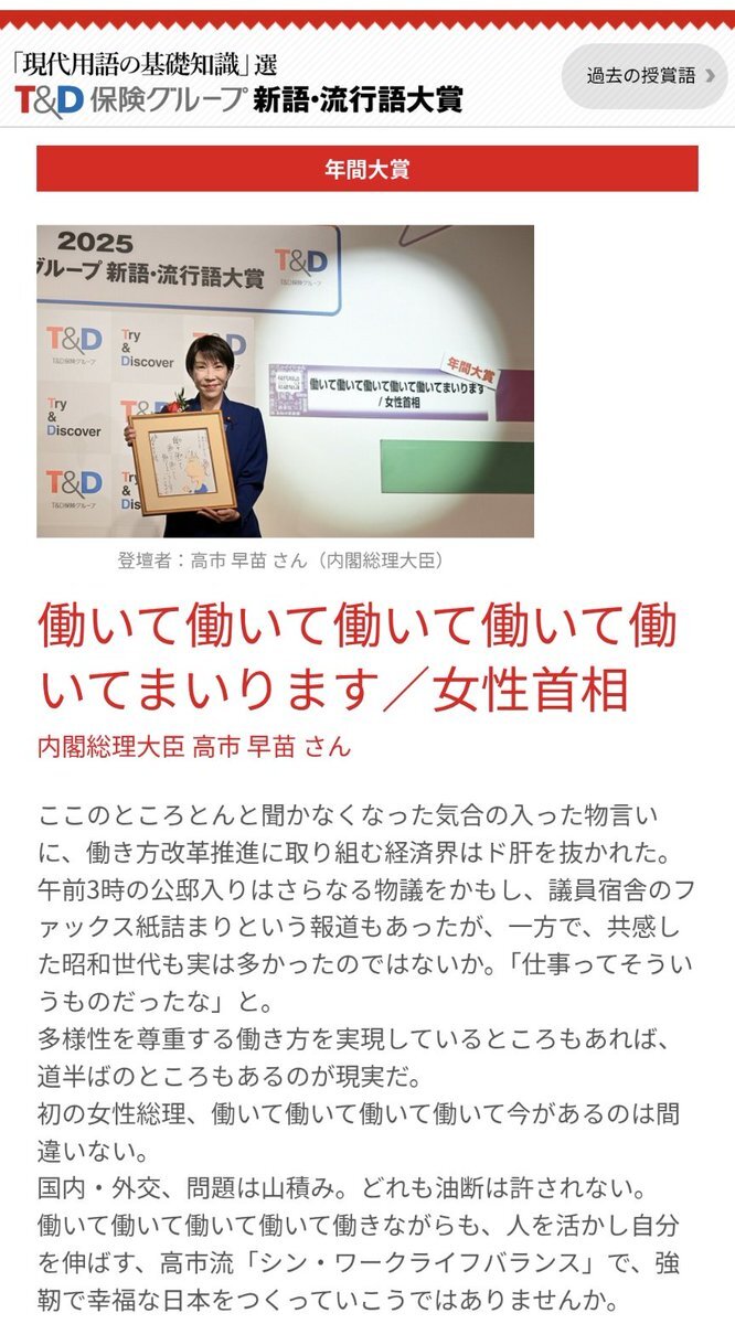 「新語・流行語大賞」年間大賞は「働いて働いて働いて働いて働いてまいります」 高市早苗首相は改めて「皆様の働きすぎを奨励するような意図はない」(中日スポーツ) news.yahoo.co.jp/articles/6d6e9… 難癖付けたり勘違いする人がいたことが衝撃だったよ。