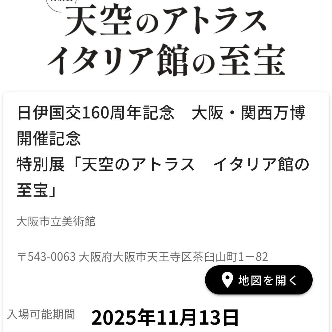 【本日より事前予約開始!】 日伊国交160周年記念 大阪・関西万博開催記念 特別展『天空のアトラス イタリア館の至宝』 📍#大阪市立美術館 👇チケットの購入はこちらから👇 🔗art-ap.passes.jp/user/e/atlas/?… ※一時的につながりにくい可能性がございます。  ご了承ください。