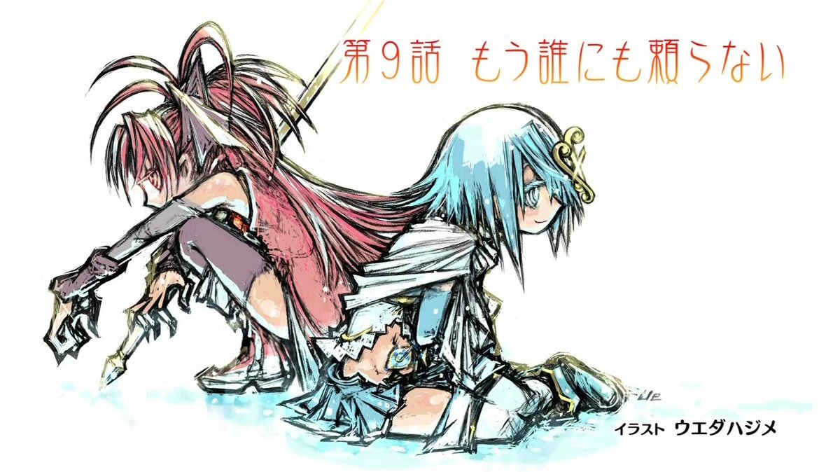 #まどマギ #まどかマギカ ウエダハジメ先生のエンドカード 向いてる方向は逆でも立ち位置(願いの起点=誰かを助けたい)は同じってさやかと杏子の関係を的確に表現しててほんと美しい……。 pic.x.com/VyDNkyNtU1