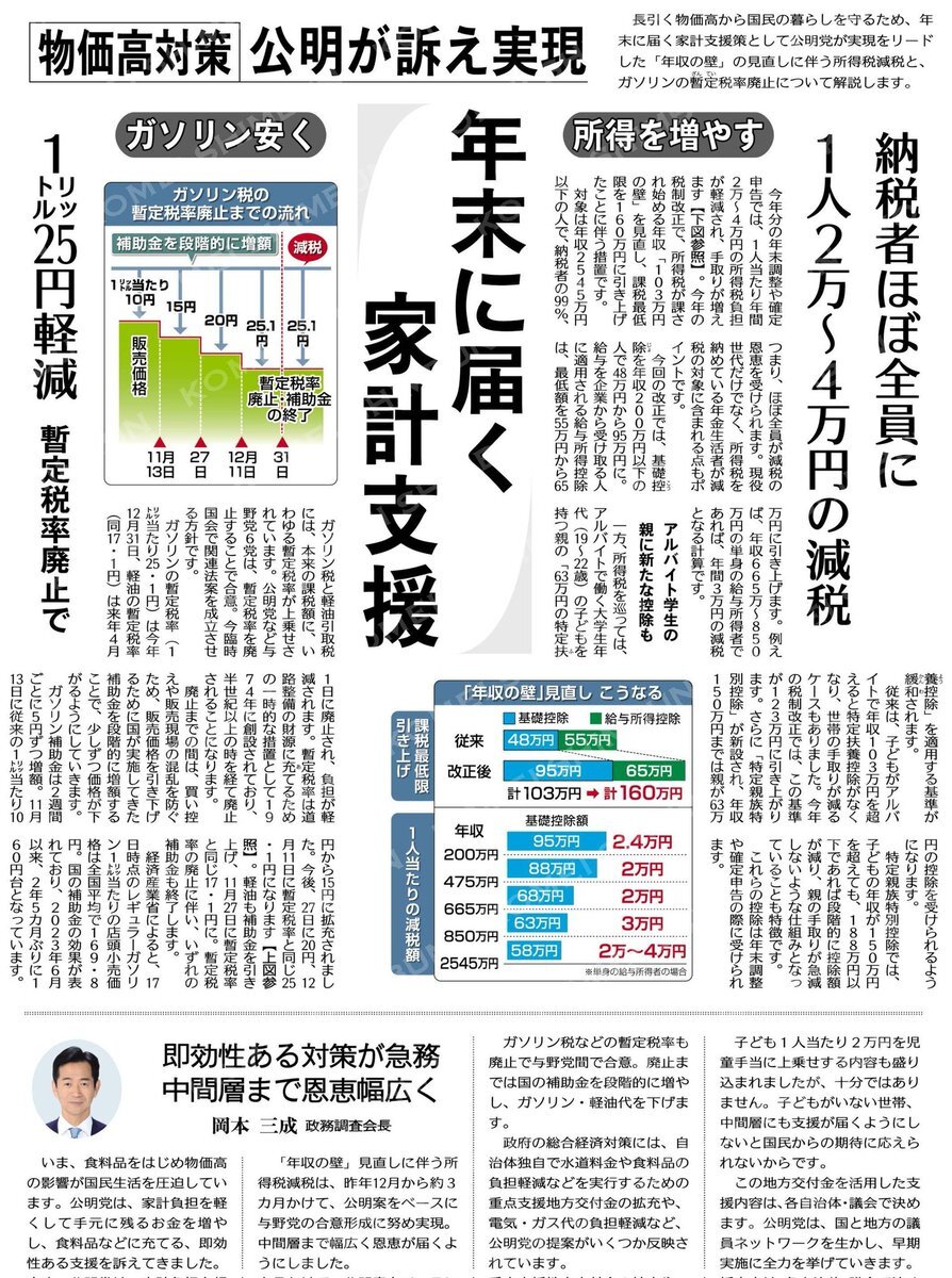 物価高対策 #公明が訴え実現 年末に届く家計支援 年末調整や確定申告で所得税減税 ○納税者ほぼ全員に 1人2万~4万円の減税! ○ガソリン税の暫定税率廃止で 1リットル25円軽減! #公明新聞電子版 2025年11月23日付 komei.or.jp/newspaper-app/ pic.x.com/CLijRSx2im