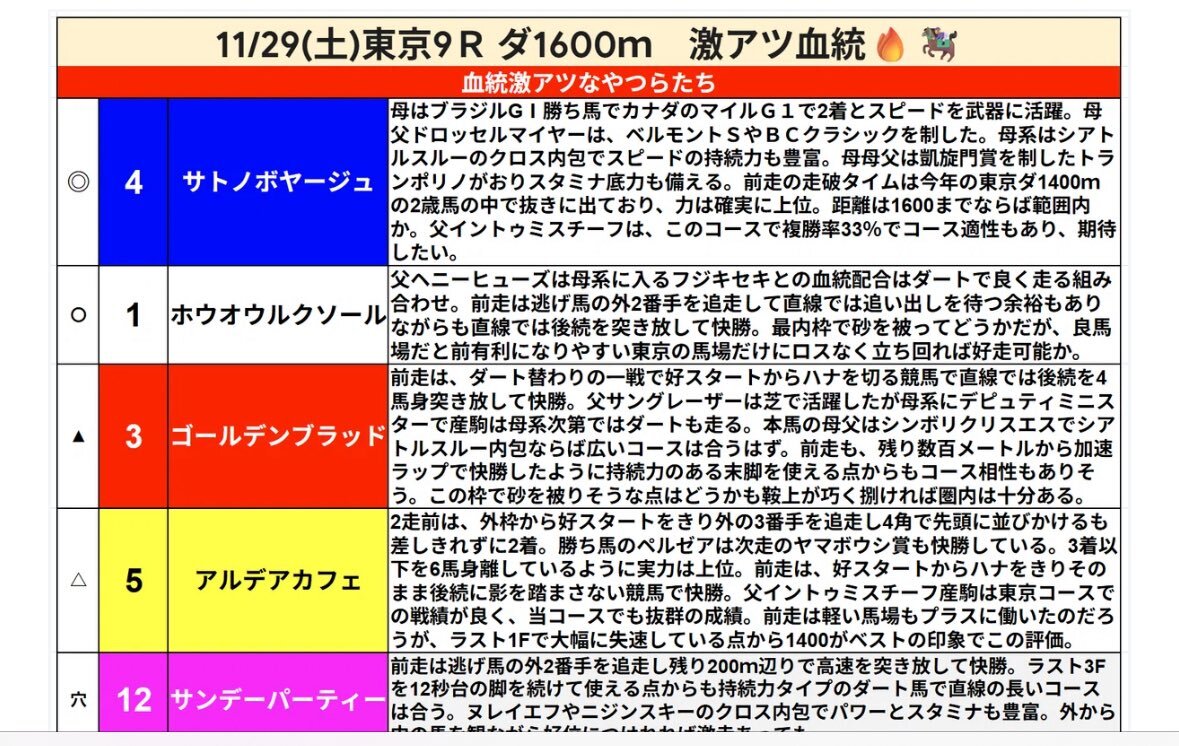 11/29(土)東京9R ダ1600m 血統予想🔥【14時10分】|具志堅バッジョ瑠生 ✅ハイレベルなメンバーが揃った2歳ダート戦🐎 ✅素質上位の本命馬◎の激走に期待します‼️ #カトレアS #東京9R note.com/gushiken_umapr…