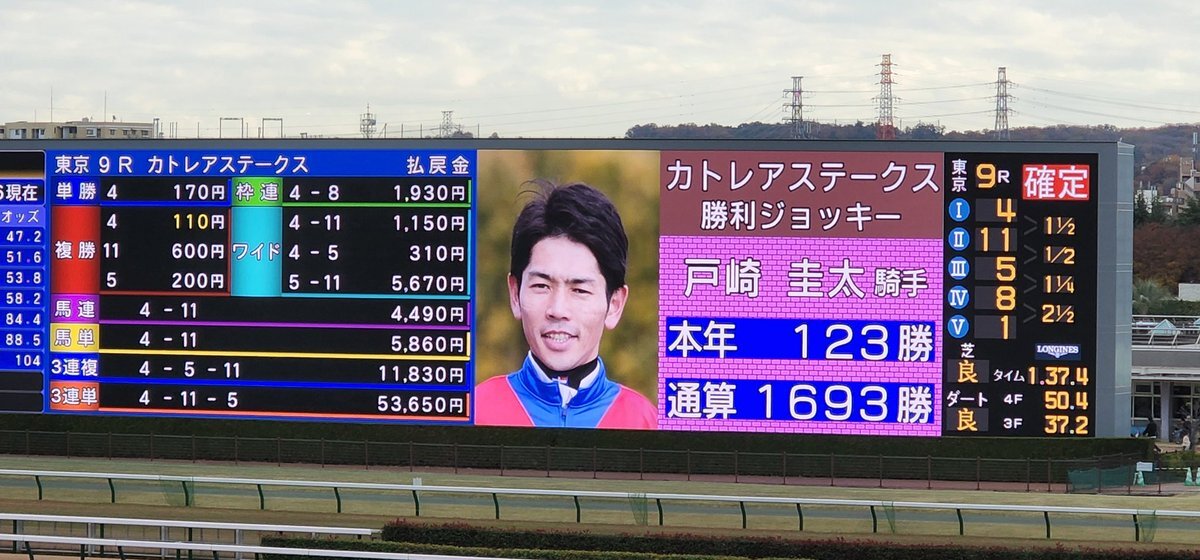 【関東騎手リーディング 11/30時点】 1位 戸崎圭太 [123-116-78-427] 1勝 2位 横山武史 [105-84-75-452] 2勝 3位 丹内祐次 [89-87-107-647] 0勝 4位 佐々木大輔 [77-64-64-599] 0勝 5位 横山和生 [69-59-51-367] 0勝 ※末尾は今週の勝利数