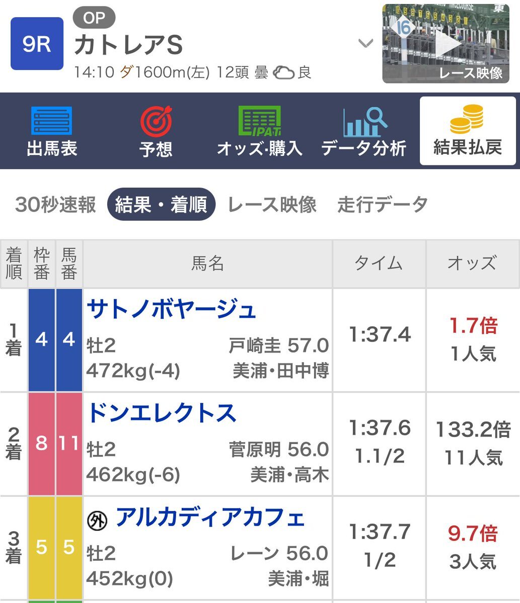 5万サンキュー サトノボヤージュお気に馬だからやったら当たりー 1.7倍のボヤージュいてこれは美味すぎー 11番人気で2着にきた菅原とドンエレクトスないすー 強い馬に勝ちにいった上位人気が垂れて追い込みの菅原が突っ込んでくる予想がドンピシャ pic.x.com/A8JR1nZb9V