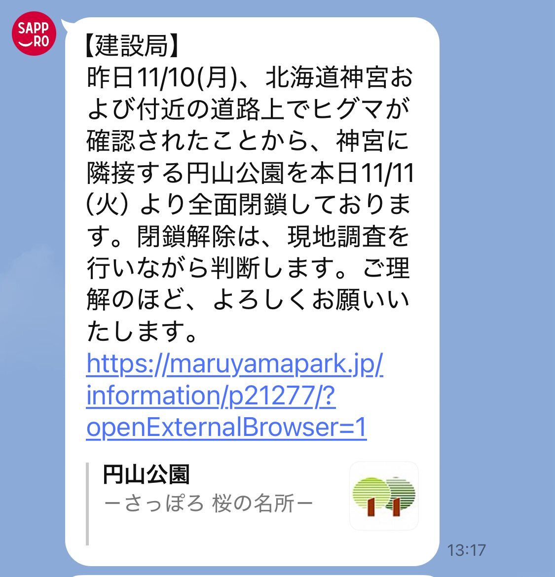 今日か明日、円山公園のバンクシーを探しに行こうとしていましたが、残念です😢💦 北海道神宮⛩️はどうなのかな?閉鎖? #札幌市 #円山公園 #ヒグマ注意報 x.com/sapporolife202…