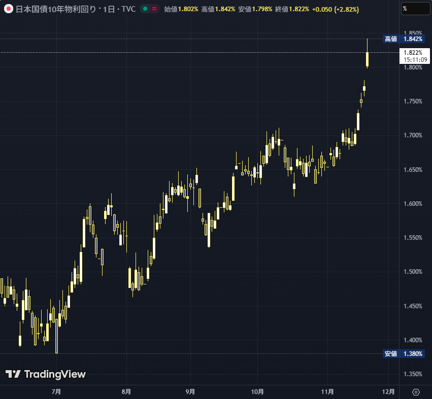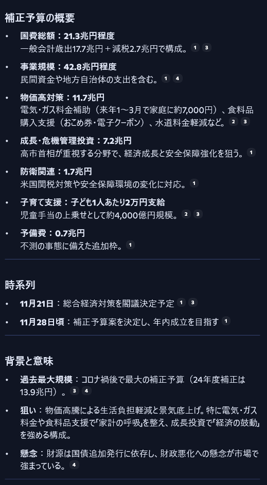 政府は2025年度補正予算について、国費ベースで約21.3兆円規模に最終調整中。 一般会計歳出は17.7兆円程度、減税分を含めて総額21.3兆円、事業規模は民間資金も合わせて42.8兆円に膨らむ見通し。 財源は国債追加発行に依存し、財政悪化への懸念が市場で強まっている。長期金利は1.842%に達した。 pic.x.com/otrQWXApms