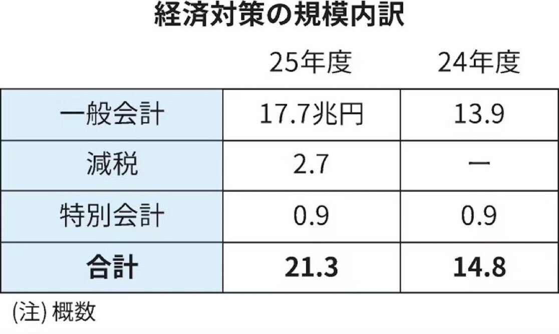 政府は20日、総合経済対策の規模について、大型減税を含めて21兆3000億円程度とする方針を固めた。財源の裏付けとなる2025年度補正予算案の一般会計歳出は17兆7000億円程度とする。21日にも閣議決定する。(時事ドットコム) x.com/jijicom/status…