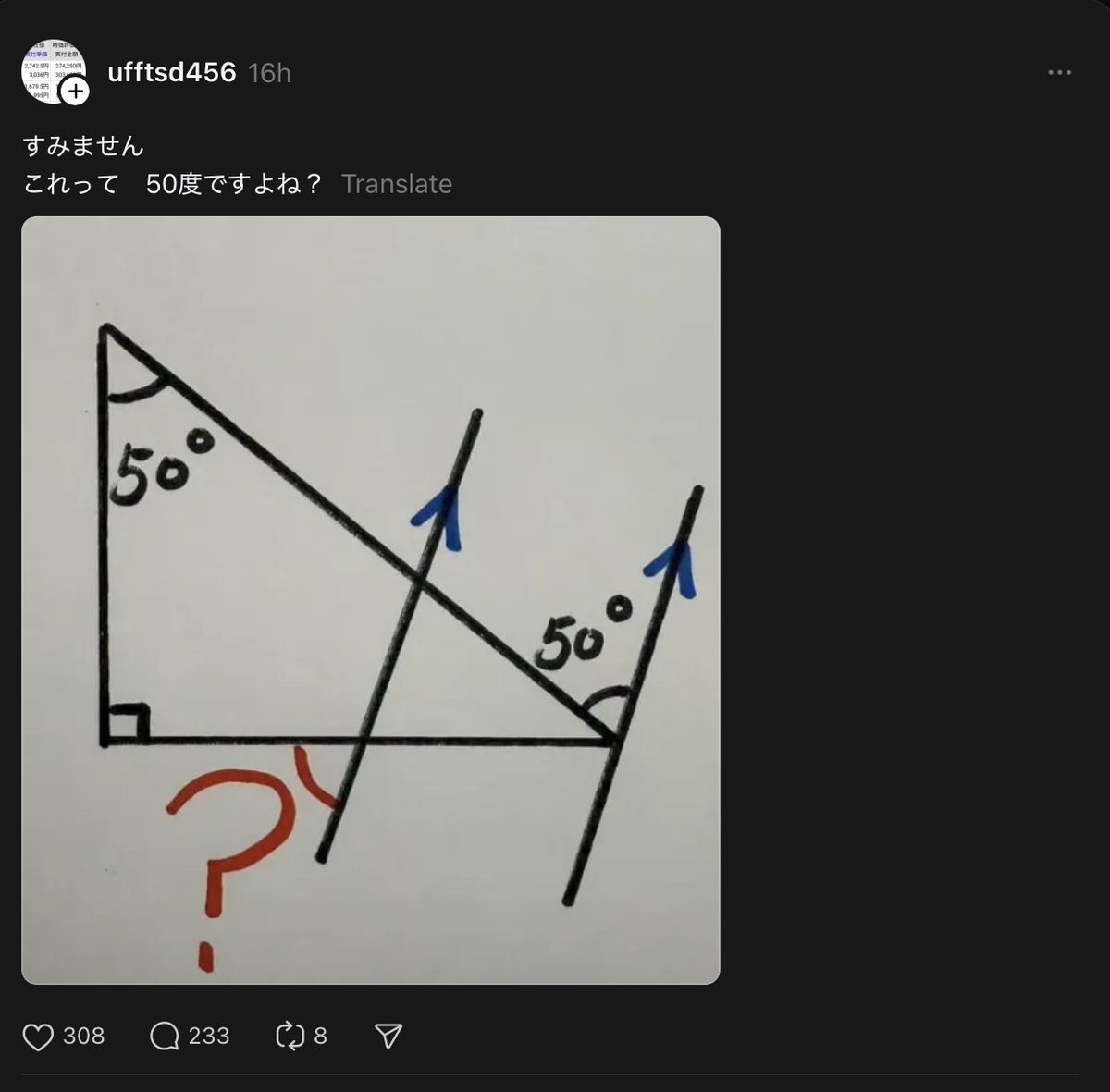 解かせてみたら、三角形の内角の和から頂点の一つが 40 度になることから、 180 - (50 + 40) = 90 度を導き出した。今度は 50 度の同位角から小さい三角形の内角の和をあれこれやって、?の対頂角が 90 度であることを導き出した時点で固まった😂 90度で∟の記号が描けたらもう少し早く解けたかも x.com/tynith/status/…