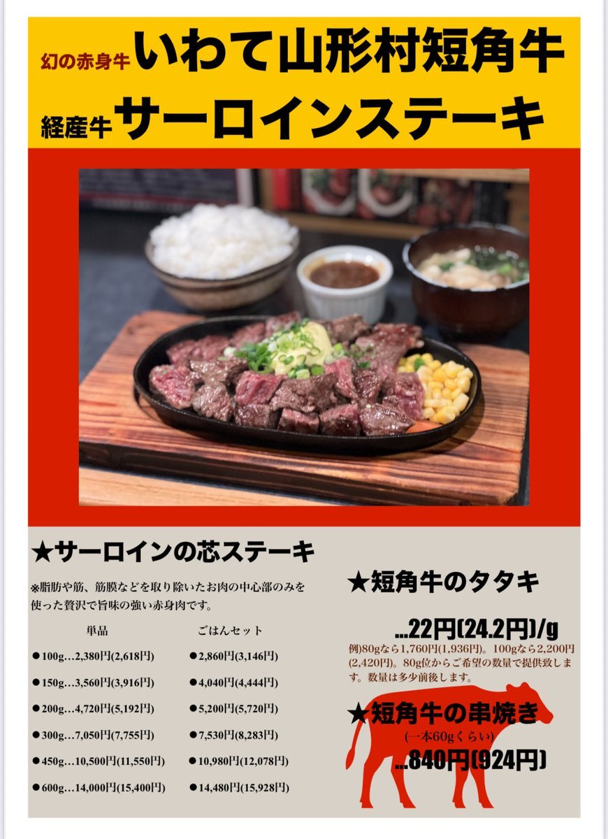 短角牛、経産牛サーロインが本日入荷しました! 10月入荷分より値上げのご案内をさせて頂いておりましたが取引先様の御厚意により、価格据え置き、短角牛のタタキや串焼きにおいては『値下げ』させて頂きました! #あいたい屋 #いわて山形村短角牛 #ステーキ #ハンバーグ #ランチ #ディナー pic.x.com/47slLoP4sV