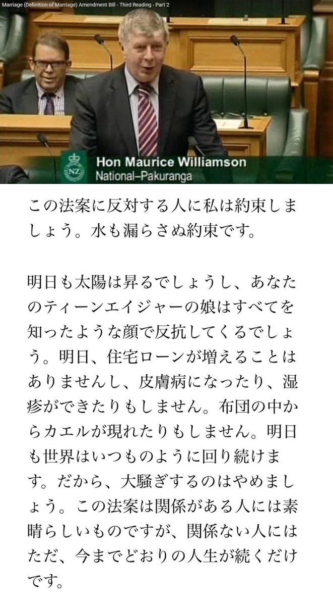 「選択肢が増える」ことに文句を言っている人が散見されますが、ではここで 2013年に同性婚を認める法案が可決された時のニュージーランド/ウィリアムソン議員の演説を見てみましょう。 x.com/YahooNewsTopic…