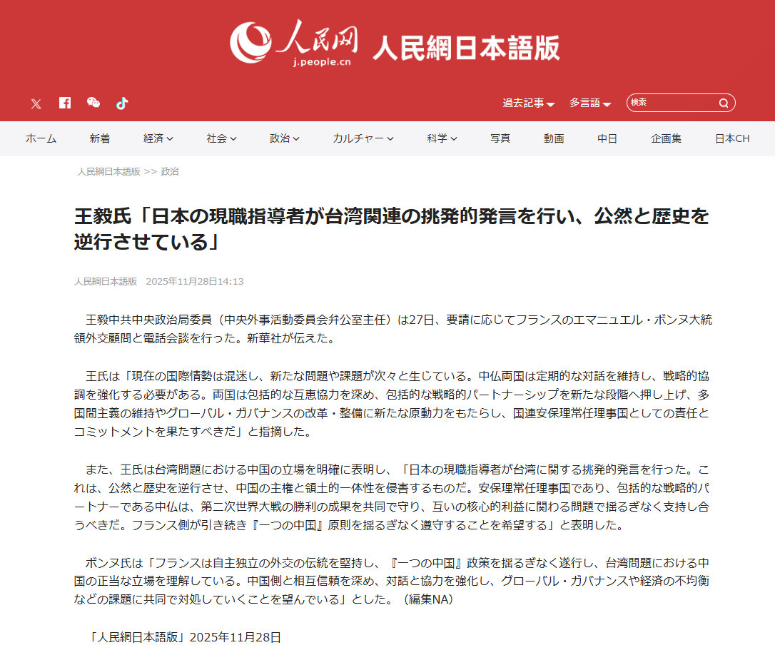 王毅中央外事活動委員会弁公室主任は27日、要請に応じてフランスのエマニュエル・ボンヌ大統領外交顧問と電話会談を行い、台湾問題における中国の立場を明確に表明し、「日本の現職指導者が台湾に関する挑発的発言を行った。これは、公然と歴史を逆行させ、中国の主権と領土的一体性を侵害するものだ。