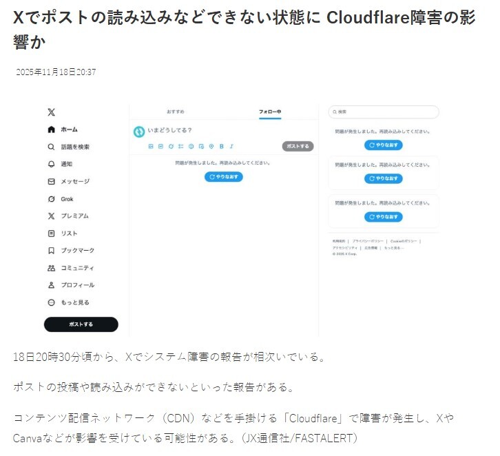 【X…訴え相次ぐ】 Xで障害か ほかのユーザーの投稿などが表示されず 11/18 20時55分ごろの段階で、 ほかのユーザーの投稿などが表示されず、 「問題が発生しました。再読み込みしてください」 といった表示のまま、 リロードしても何も示されない状態となった。 !カルトの仕業か?… x.com/livedoornews/s…