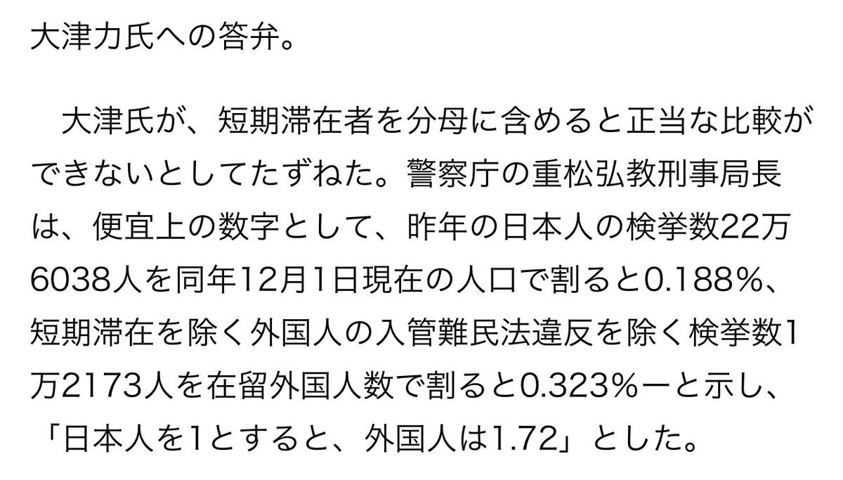 >警察庁が、昨年の外国人の犯罪率は日本人の1.72倍だったという数字を >20日の参院内閣委員会で明らかにした。 >観光などの短期滞在者を除いた検挙(摘発)人数を比較した。参政党の大津力氏への答弁。
