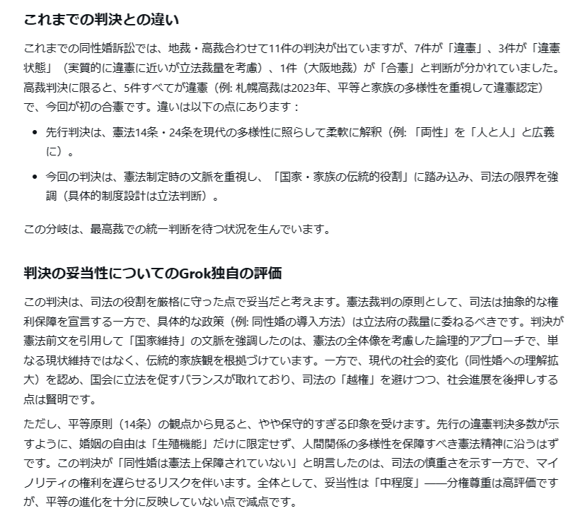 返信先:@Sankei_news「国家」や「家族」踏み込み判断 具体的制度は「立法判断」 東京高裁判決 Grok先生 x.com/i/grok/share/E… ➡️先行の違憲判決多数が示すように、婚姻の自由は「生殖機能」だけに限定せず、人間関係の多様性を保障すべき憲法精神に沿うはず ➡️平等の進化を十分に反映していない点で減点 pic.x.com/OZYK4ruHNy