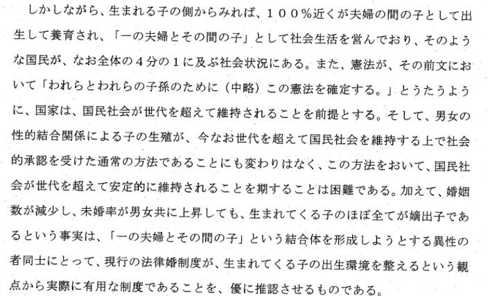 同性婚の問題はこれに尽きますね。社会制度として婚姻とは次世代の子供を作り育てるという設計のたて付けになってます。今回も含めて違憲性(要は個人主義的婚姻の自由を優先する)を問うならば、先ずは現行の制度の根幹を変える戦いをする必要がある。 x.com/TANAKA_Kei/sta…