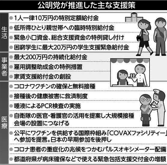 公明党が実行した政策。 幼稚園から高校、大学教育の無償化。 私立高校の授業料の実質無料化。 出産一時金50万に増額。 10万円の特別定額給付金 コロナ禍の事業者への持続化給付金。 家賃支援給付金の創設。 もっとも、やらかした政策。 中国人に簡単な免許配布と、コロナワクチン推進やPCR検査推進。
