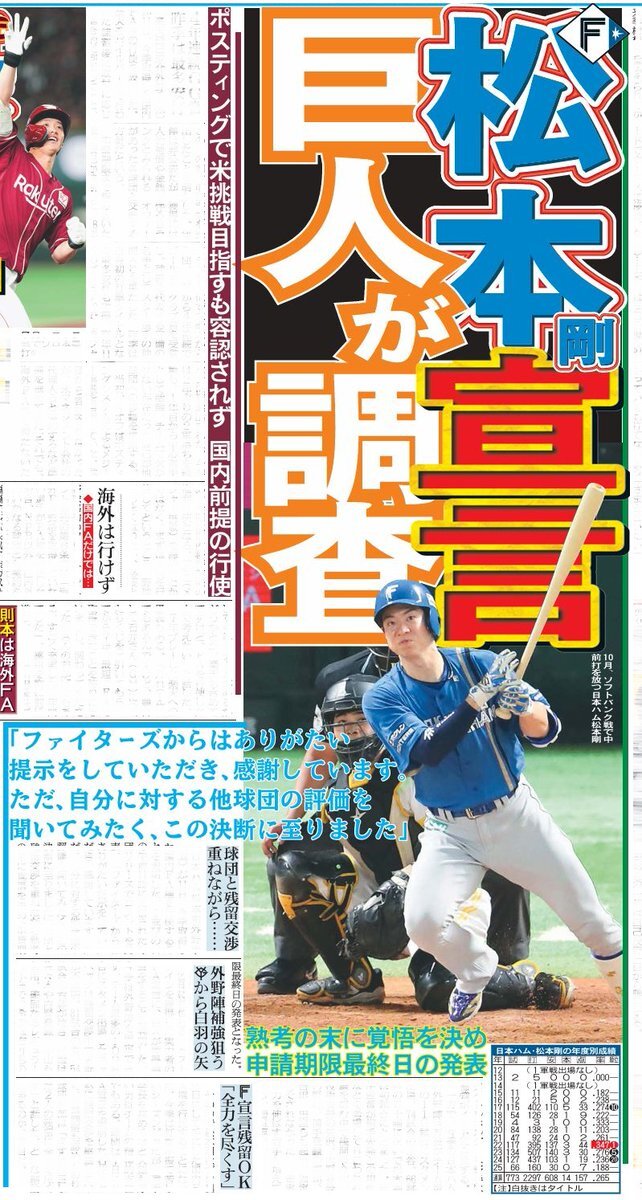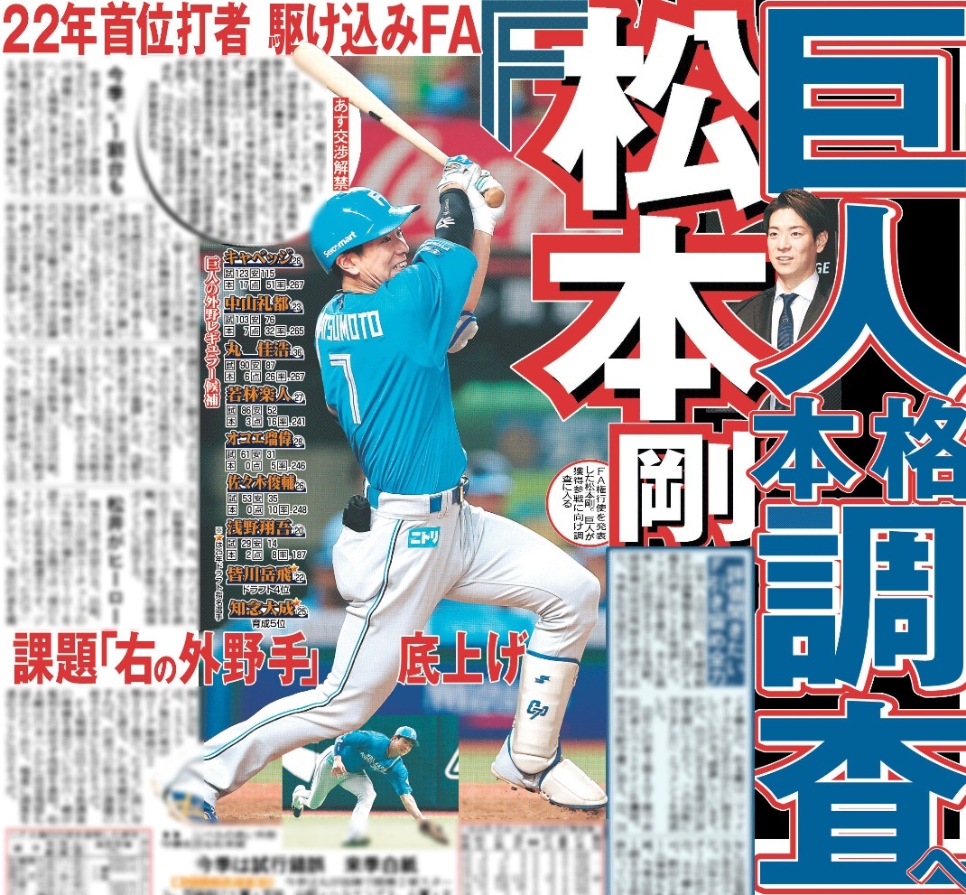 【11/12付 #スポーツ報知 #巨人 】 🔶課題“右の外野手”底上げへ🔶 駆け込みFA #日本ハム #松本剛 選手    『巨人が本格調査へ』 _________________ あす交渉解禁 #ジャイアンツ #giants #FA