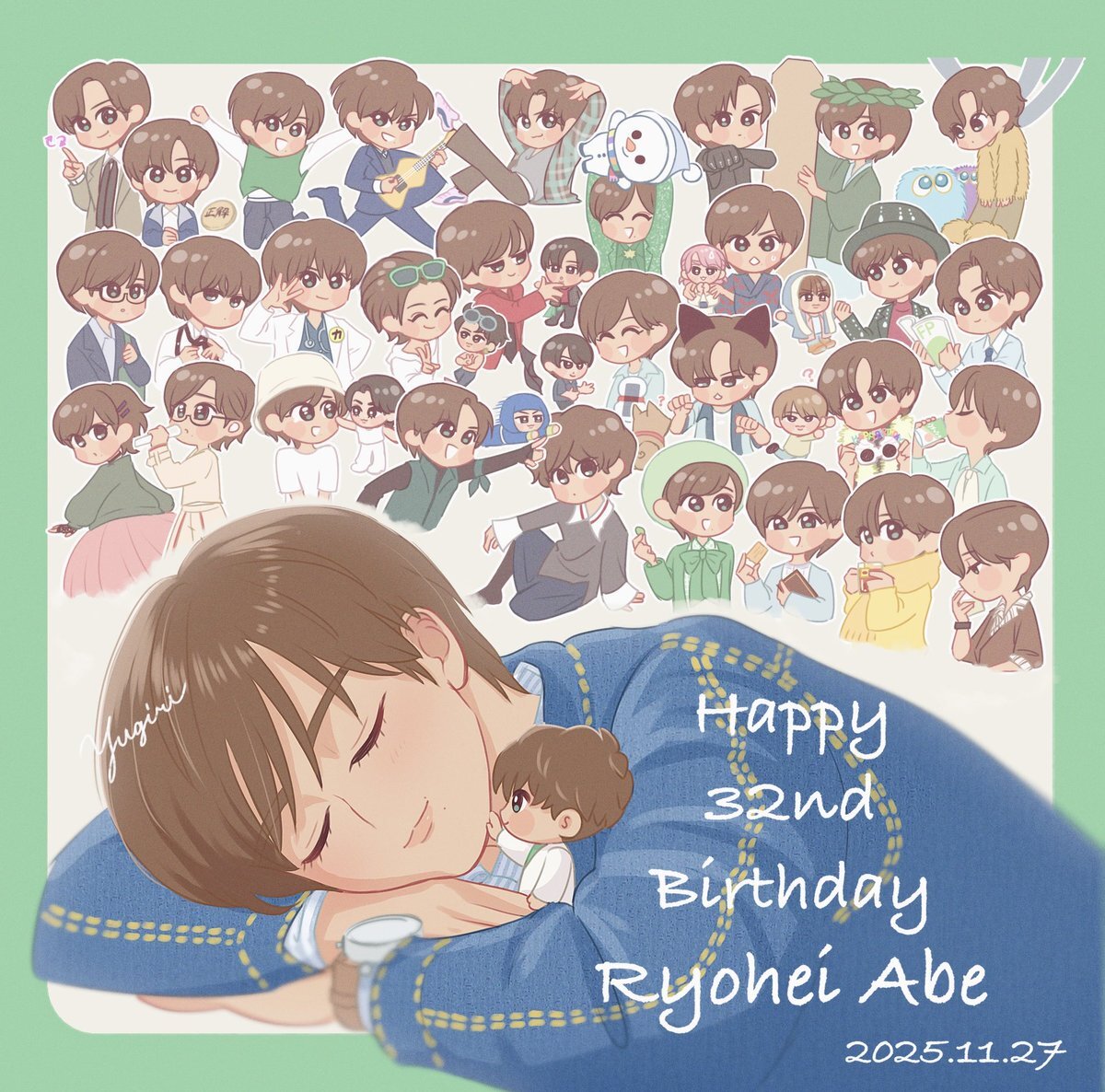 遅れちゃったー😭😭😭 お誕生日おめでとうございます💚 いつも幸せをありがとう😿大好きです! 阿部くんの幸せを心から願っています🍀🍀🍀 (32歳のお誕生日にちなんで32人の阿部くんを描きました♪) #阿部亮平誕生祭 #阿部亮平誕生祭2025 pic.x.com/xZ1dHIa8et