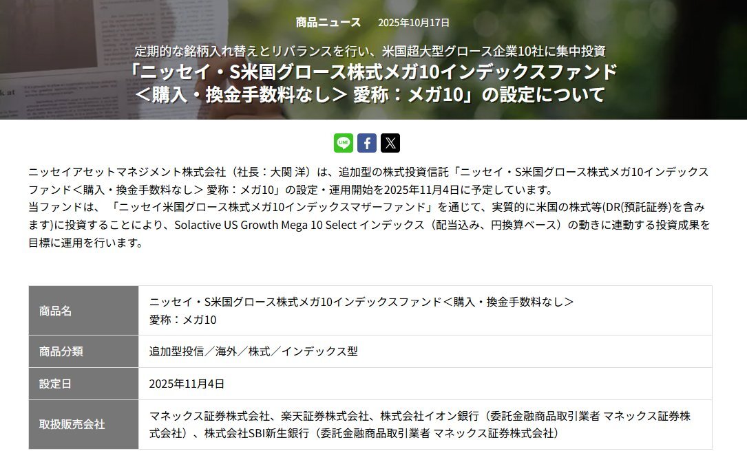 新しい投信キタ━━━━(゚∀゚)━━━━!! ▼ニッセイ・S米国グロース株式メガ10インデックスファンド ✅投資対象:米国グロース株のうち時価総額上位10社 ✅信託報酬:0.385%(税込) ✅運用開始:11月4日 NISA成長投資枠対応だそう FANG+あたりと似た成績になりそうだよね pic.x.com/csVGERHhFE