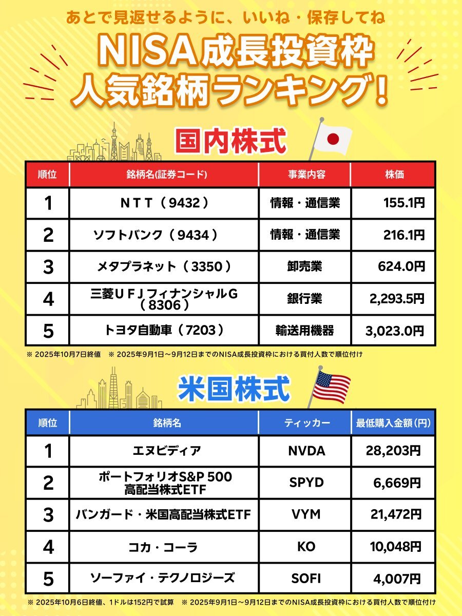【要いいね&保存!】 NISA成長投資枠人気銘柄ランキング! 今回は、国内株式・米国株式の人気銘柄TOP5を一覧でまとめました。 ※本投稿は、特定の銘柄への投資を推奨するものではありません。