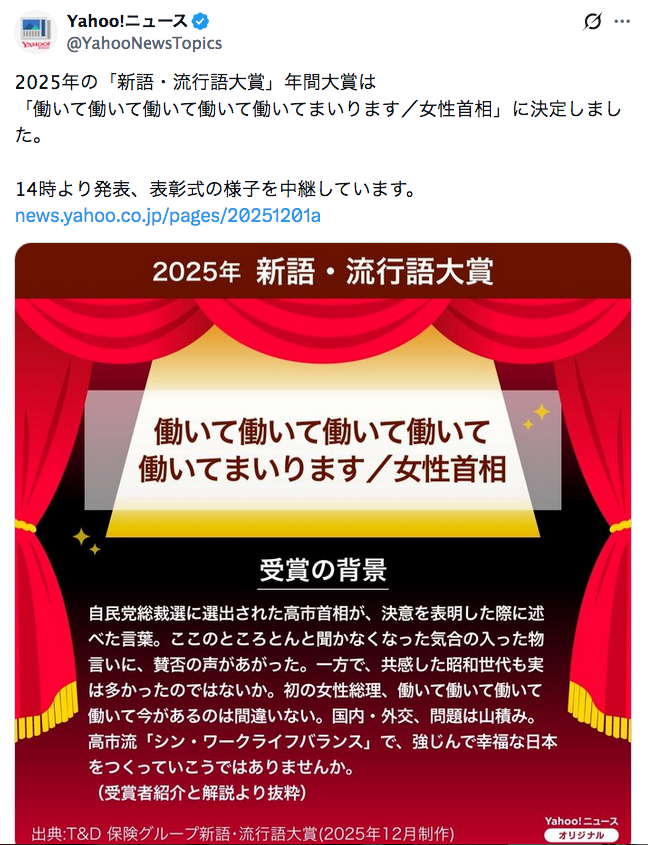 高市早苗の「働いて、働いて」が、働きたくない日本人の流行語大賞?→ 2025年「新語・流行語大賞」 - Yahoo!ニュース news.yahoo.co.jp/pages/20251201a