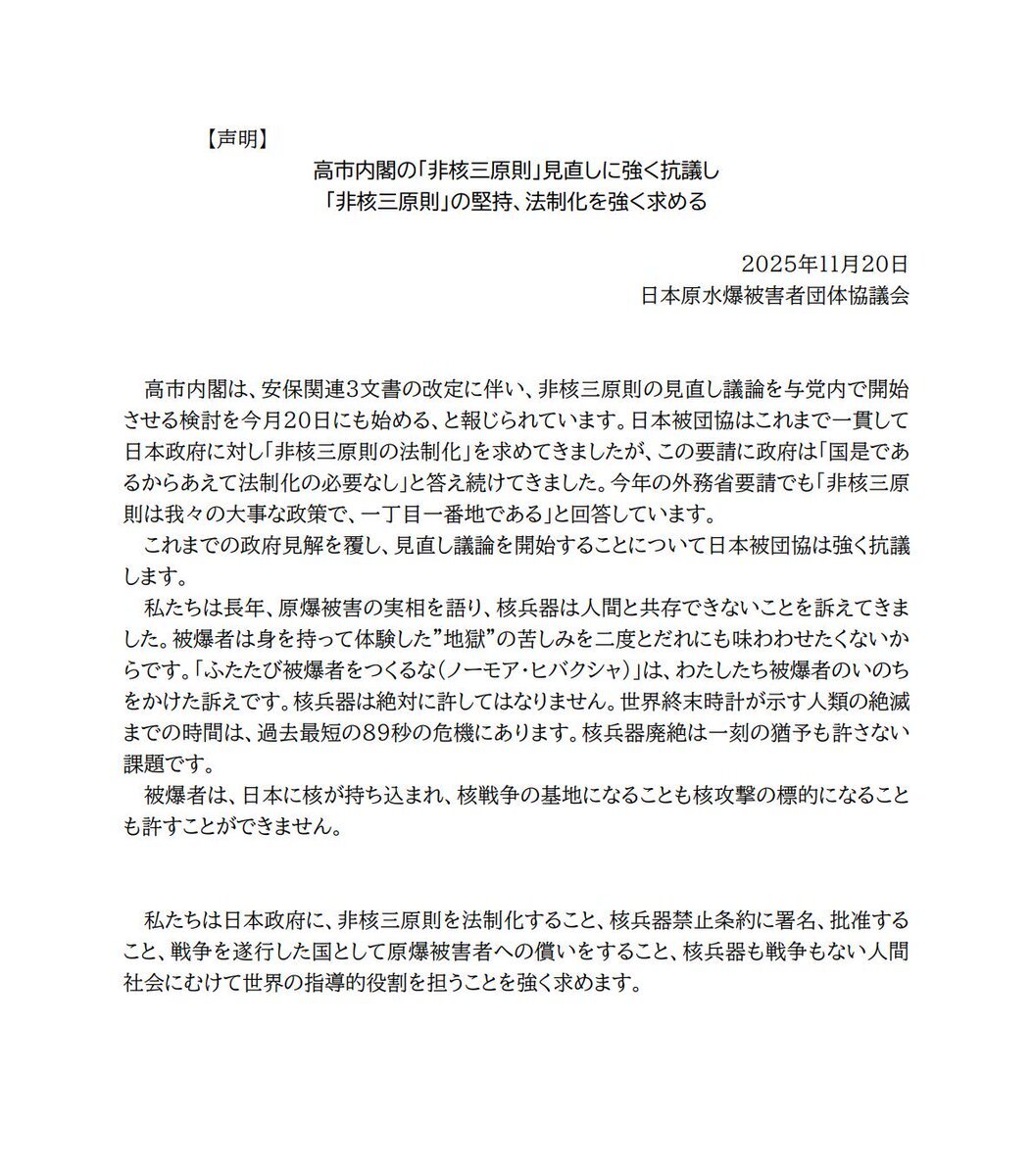 日本原水爆被害者団体協議会(日本被団協)は、高市内閣の「非核三原則」見直しに強く抗議し「非核三原則」の堅持、法制化を強く求めます。