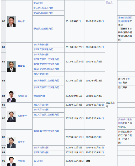 歴代官房長官は以下のように並ぶ。 藤村 2011年~2012年(野田内閣なので該当しない) 菅  2012年~2020年(開示請求した期間内に在任) 加藤 2020年~2021年(同上) 松野 2021年~2023年(同上) 林  2023年~2025年(同上) 木原 2025年~(記事の時点では官房長官になっていない) pic.x.com/o0IdpfTqIO