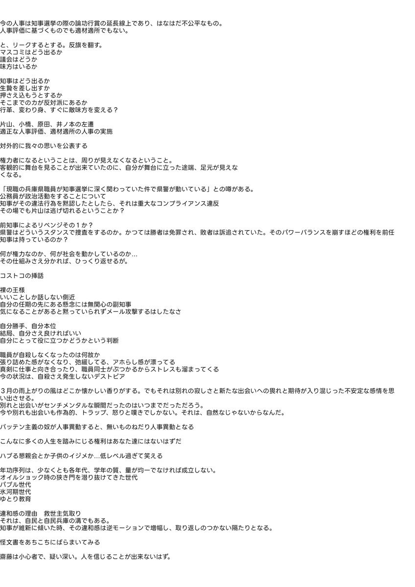 元県民局長公用PC内の「感想などの携帯メモ」がSAKISIRUさんによって公開されたので、全文文字起こししました。 「怪文書をあちこちにばらまいてみる」 「クーデターを起こす方法はあるのか?」 等と書かれた文書です。 👇SAKISIRU note.com/sakisiru/n/ndf… 👇文字起こし