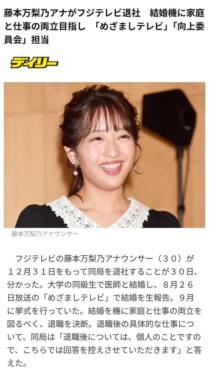 藤本万梨乃アナがフジテレビ退社 結婚機に家庭と仕事の両立目指し 「めざましテレビ」「向上委員会」担当(デイリースポーツ) news.yahoo.co.jp/articles/e562f…