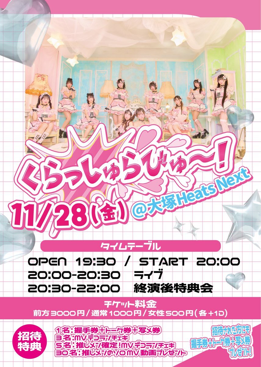 ❤︎ーーーーーーーーーーー❤︎ 2025.11.28(Fri) 『くらっしゅらびゅ〜!』 @ 大塚Heats Next ❤︎ーーーーーーーーーーー❤︎ 前方¥3000/通常¥1000/女性¥500(各+1D) 🉐招待人数に応じて特典付き! 🎁招待された方も特典あり🎁 🎟️10/29 20時〜販売開始 t.livepocket.jp/e/ekrna