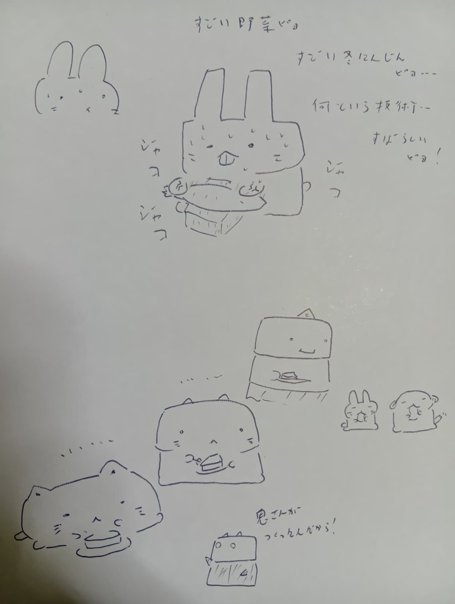 #冬にんじんの日 鋼鐵塚さんみたく、一心不乱に冬にんじんを研ぐ、うにウサでした。 #鬼滅の刃 鬼さんが冬にんじんケーキをつくったけれど、うにネコとダンゴねこは⋯⋯ pic.x.com/S0fiD9dv6Y