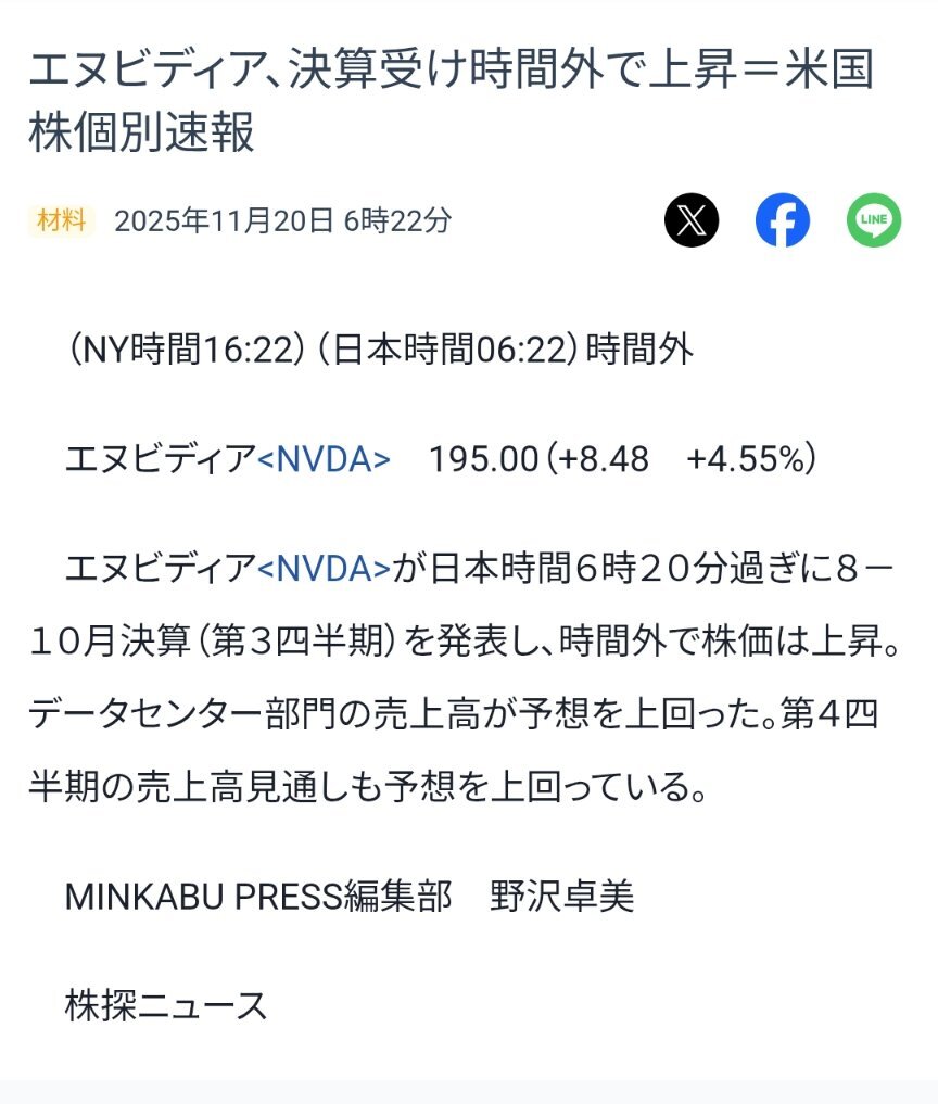 11月20日木曜日おはようございます😊☕ NY市場は3指数揃って上げ⤴️ SOX指数+1.8%⤴️ エヌビディア時間外で+5%⤴️😆 ナス時間外で+1.5%⤴️😆 日経平均先物 50,220 現物気配いろいろすごい😊キオクシアS高 ドル円 156.98 今日もよろしくお願いします😊