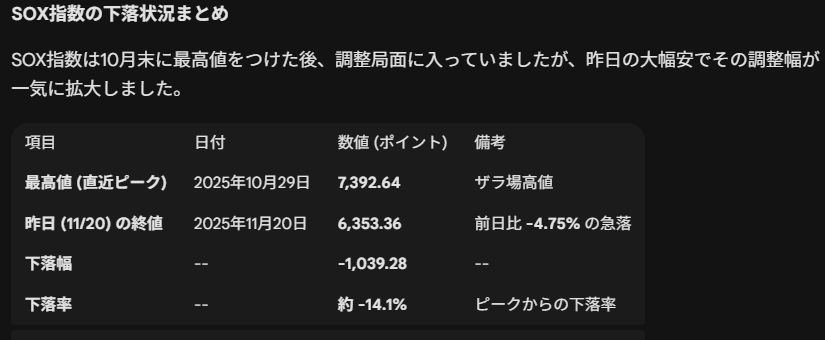 SOX指数 最高値: 7,392.64 (2025/10/29) -20%ライン: 5,914.11 pic.x.com/Qsj280ckE4