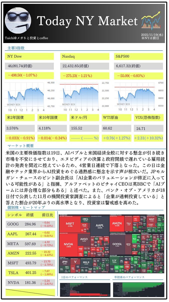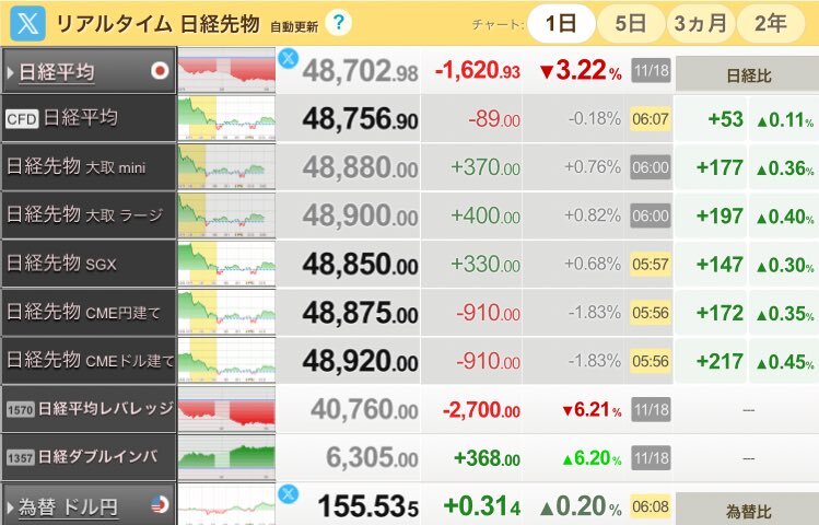 11月19日水曜日おはようございます☕ NY市場は3指数揃って続落⤵️ SOX指数-2.3%⤵️ 日経平均先物 48,830 ドル円 155.54 明朝エヌビディア決算 今日もよろしくお願いします😊