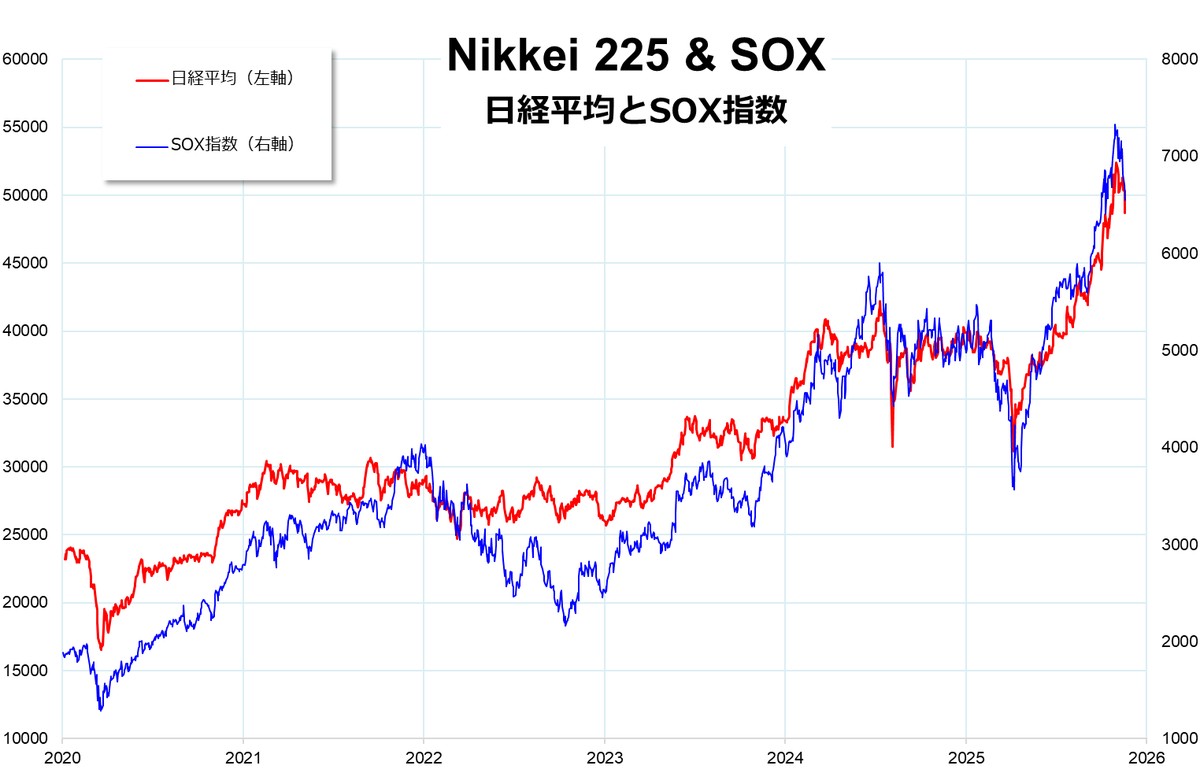 とんでもない高低差 エヌビディア、サンディスク崩壊の影響かSOX指数も下落。 半導体AI以外がどれだけ影響を受けるか。 日経は中期線で反発できなければ46,200までサポートなし。