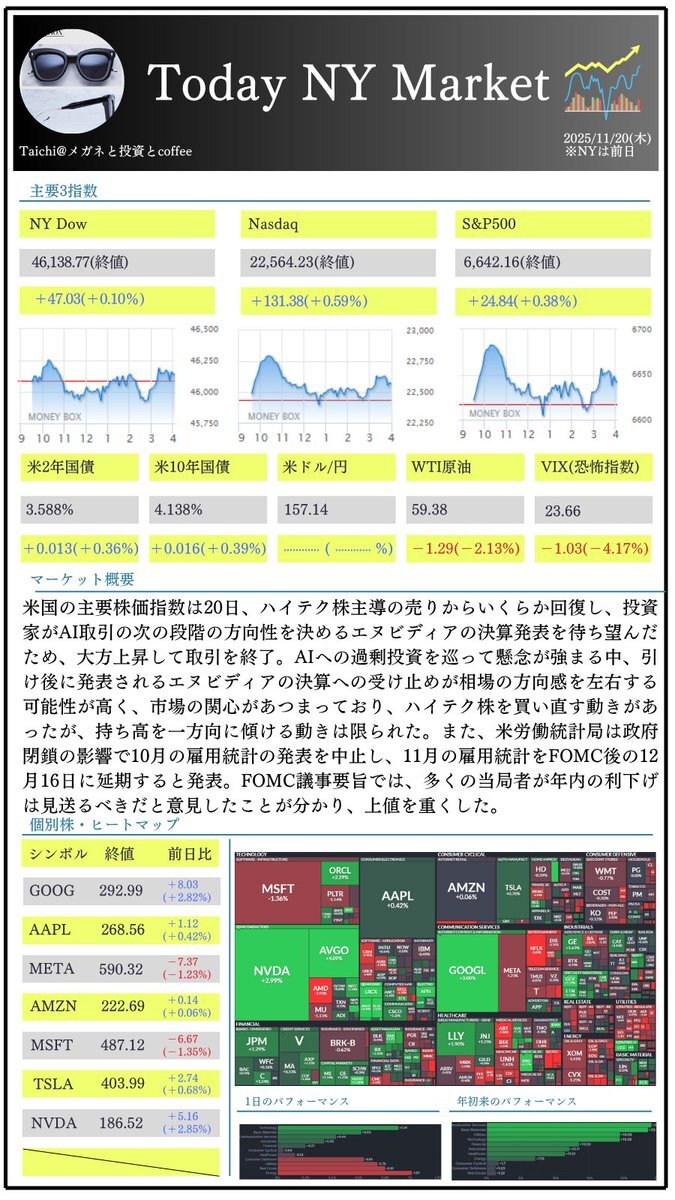🇺🇸2025/11/19📊ダウ市況 NYダウ 46139(+47 +0.10%) NASDAQ 22564(+131 +0.59%) S&P500 6642↑🧾SOX指数6670↑ 📈NY反発も方向感薄い🤖AI買戻しも伸び悩み 🤖ジェミニ3で買われる🏛️議事録で利下げ後退感 ⚠️NVDA決算・雇用統計👀先物は反発🗾 #日経平均 #米国株 #ダウ平均 #投資