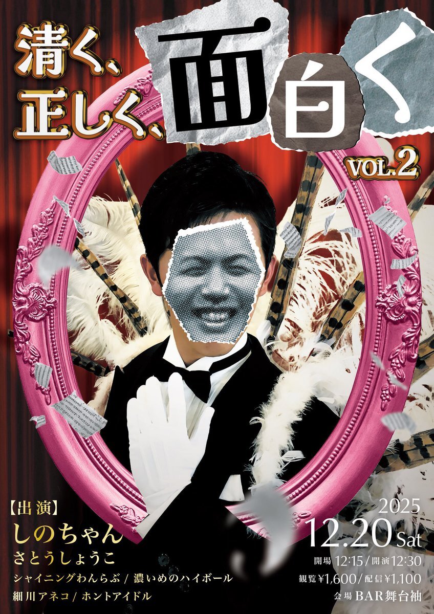 『清く、正しく、面白く vol2』開催決定! 日時:12/20(土)12時30分〜 場所:BAR舞台袖 料金:1600円(配信有) スペシャルゲストは松竹のさとうしょうこさん! ポスターは愛梨さん@airi_molding に作成頂きました! ご来場お待ちしております🙇 tiget.net/events/439925 twitcasting.tv/gensuuuuuu/sho…