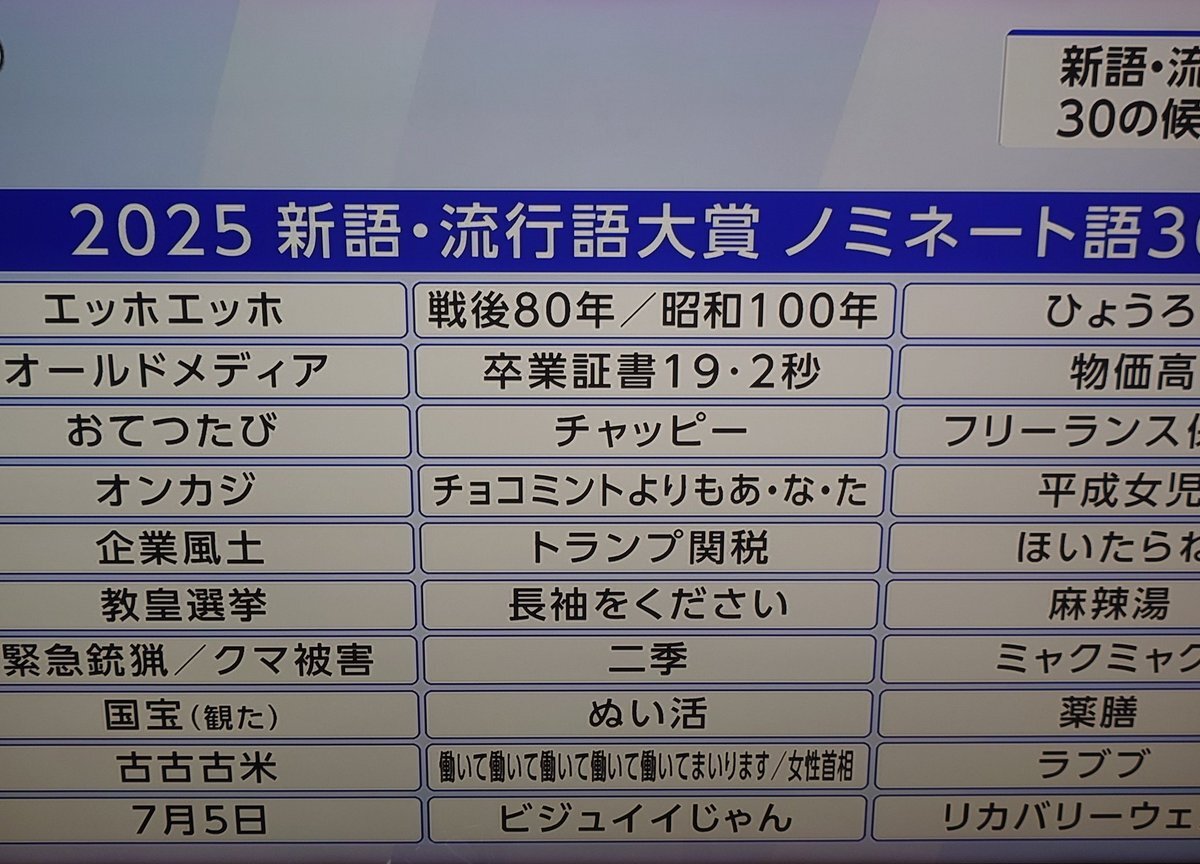 【速報】現代用語の基礎知識 選「2025 T&D保険グループ新語・流行語大賞」ノミネート30語発表 news.livedoor.com/article/detail… 1. エッホエッホ 2. オールドメディア 3. おてつたび 4. オンカジ 5. 企業⾵⼟ 6. 教皇選挙 7. 緊急銃猟/クマ被害 8. 国宝(観た) 9. 古古古⽶ 10. 7⽉5⽇ 11. 戦後 80