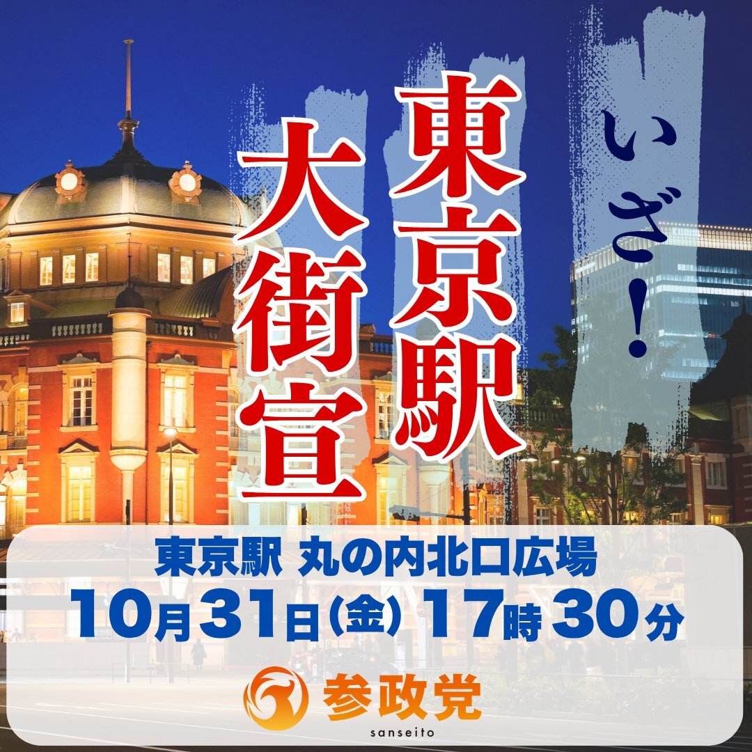 📣 参政党・東京駅大街宣 開催のお知らせ 📣 開催まであと2日! 10月最後の金曜夜、東京の玄関口である東京駅前にて、参政党の大規模街頭演説会を開催いたします。 「いざ!集まらん!」 お仕事帰り、学校帰りの方も、ぜひ足をお運びください。 多くの方のご参加を、心よりお待ちしております。