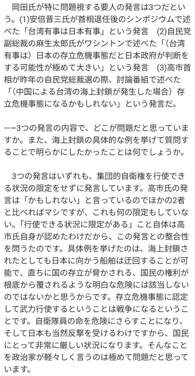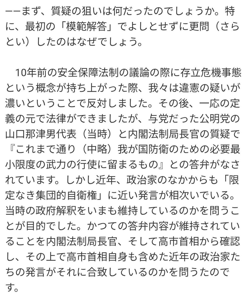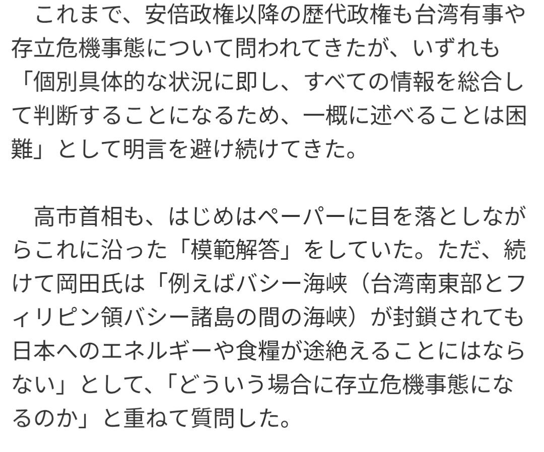 岡田克也が問題視したのはこれまでの政権与党幹部や今回の高市の無限定に集団的自衛権を行使しうるかのような発言内容の、憲法での自衛権についての従来の解釈との整合性。 むろん自衛官や民間人の命がかかっており、戦争になれば日本は甚大な被害を被りうるから。 それをスパイだのとなんだのと(怒)。 pic.x.com/nIbBLQDkTm