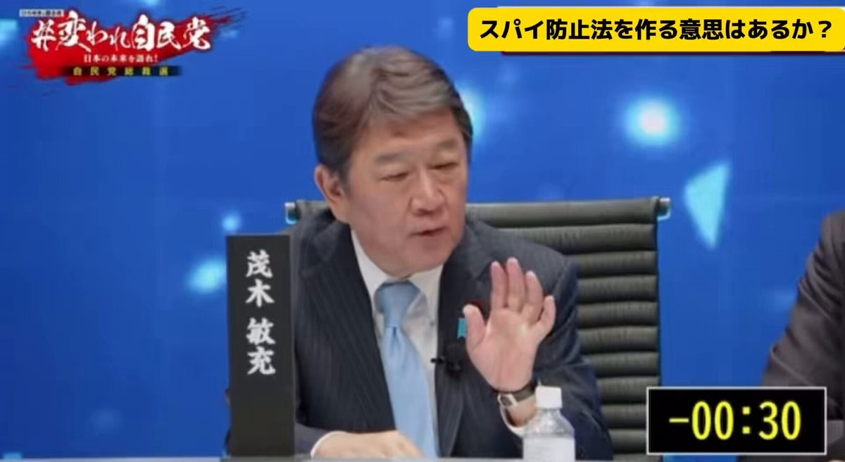 これ本当に酷い切り抜き… 「スパイ防止法は必要ない」という文言だけ切り抜かれて、あたかも理由もなく反対してるような印象操作😢 実際、どの候補者も "日本の仕組みにあったスパイ防止策"は前向きに考えている 90秒だけフル動画ご覧ください‼️ (林芳正、茂木敏充、高市早苗候補の主張まとめ)↓ x.com/tweet_tokyo_we…