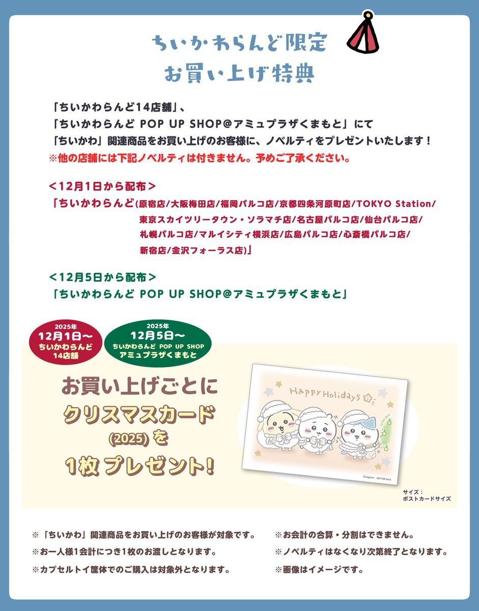 🎪#ちいかわらんど \🌟ノベルティのお知らせ🌟/ 12月1日(月)〜、 ちいかわらんどにてちいかわ商品をお買い上げのお客様に、 『クリスマスカード(2025)』を1枚プレゼント🎁 ぜひチェックしてください🎅🎄 ※ちいかわらんどPOP UP SHOPアミュプラザくまもとでは、12月5日(金)より配布いたします pic.x.com/UfRv1giViB