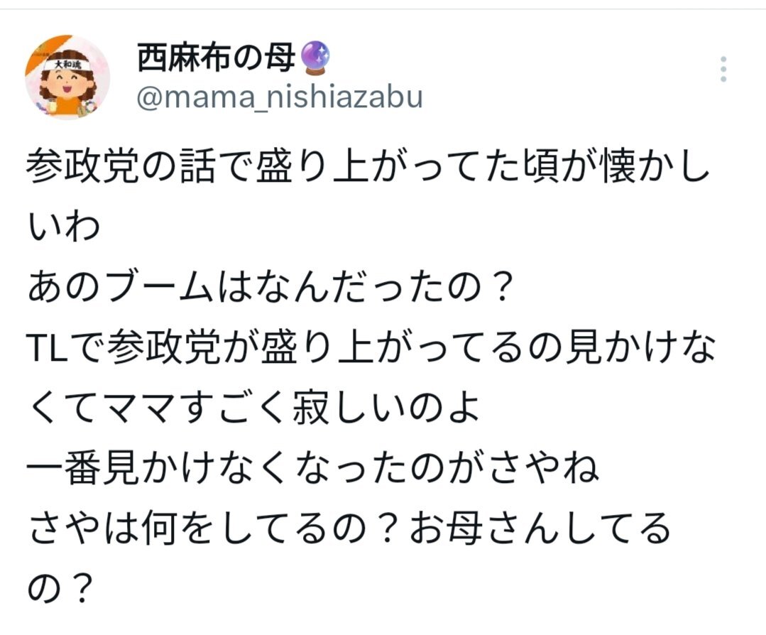 参政党の話で盛り上がってた頃が懐かしいわ あのブームはなんだったの? TLで参政党が盛り上がってるの見かけなくてママすごく寂しいのよ 一番見かけなくなったのがさやね さやは何をしてるの?お母さんしてるの?