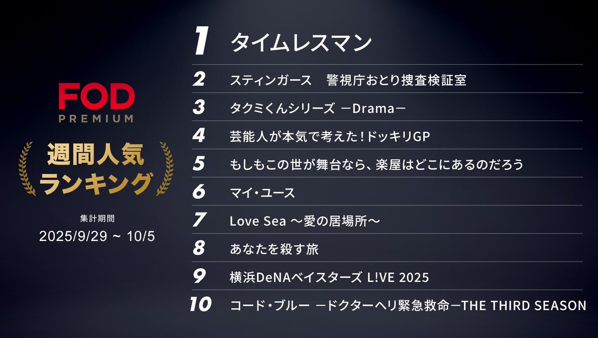 🏆#FODプレミアム 週間人気ランキング🏆 <集計期間:2025年9月29日~10月5日> 🥇:#タイムレスマン 🥈:#スティンガース 警視庁おとり捜査検証室 🥉:#タクミくんシリーズ -Drama- 4位:芸能人が本気で考えた!ドッキリGP 5位:もしもこの世が舞台なら楽屋はどこにあるのだろう pic.x.com/NflhJims9f