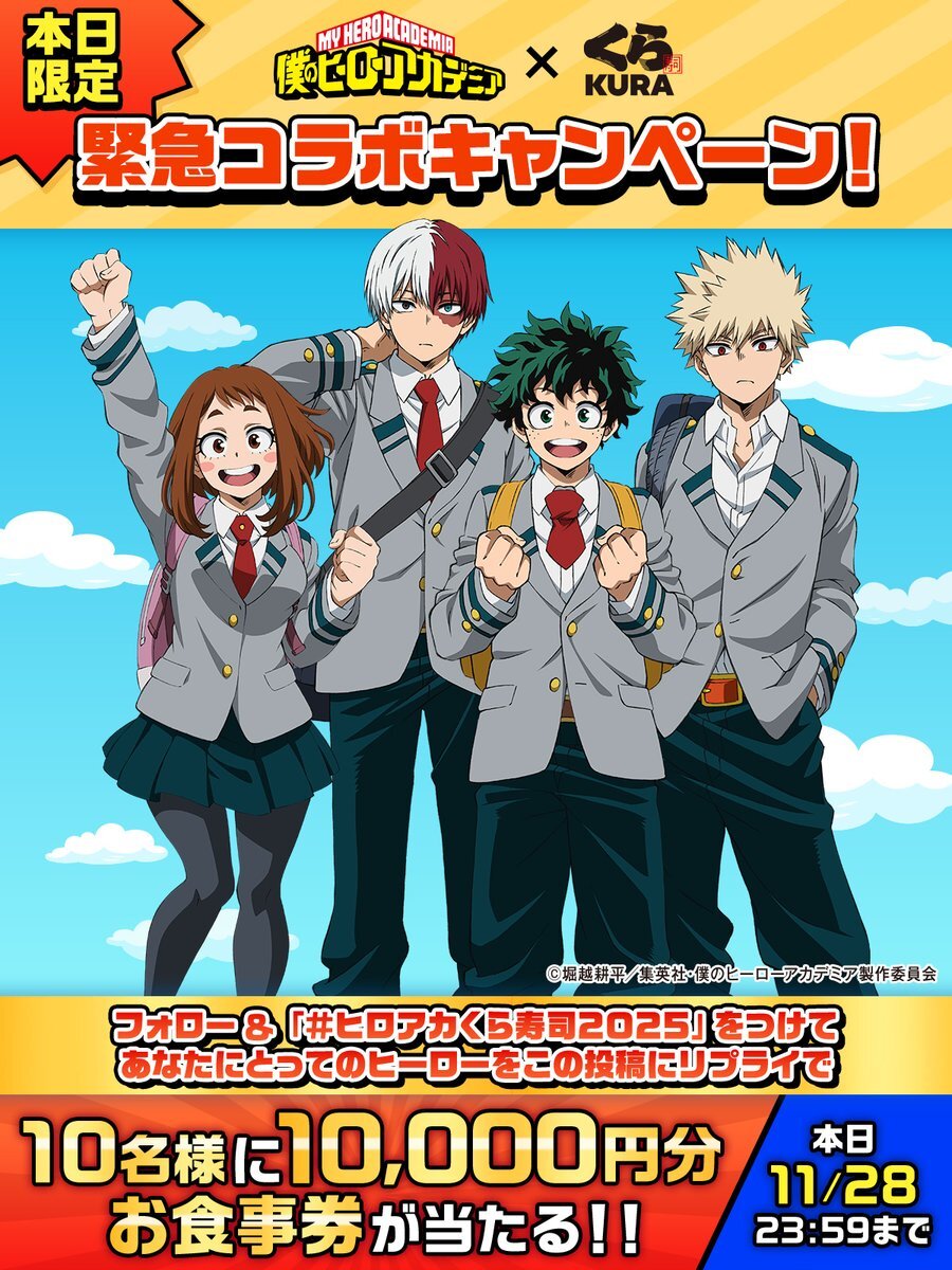 \ ⏰本日限定!!⏰/​ #僕のヒーローアカデミア × #くら寿司​ コラボを記念して緊急開催!👊🔥​ あなたにとってのヒーローを教えてね!​ 身近な人でも、憧れの人でもOK🙆‍♂️​ 抽選でお食事券が当たるチャンス🎁​ ​ 【11/28 23:59まで!!】​ ① @mutenkurasushi をフォロー​ ② #ヒロアカくら寿司2025