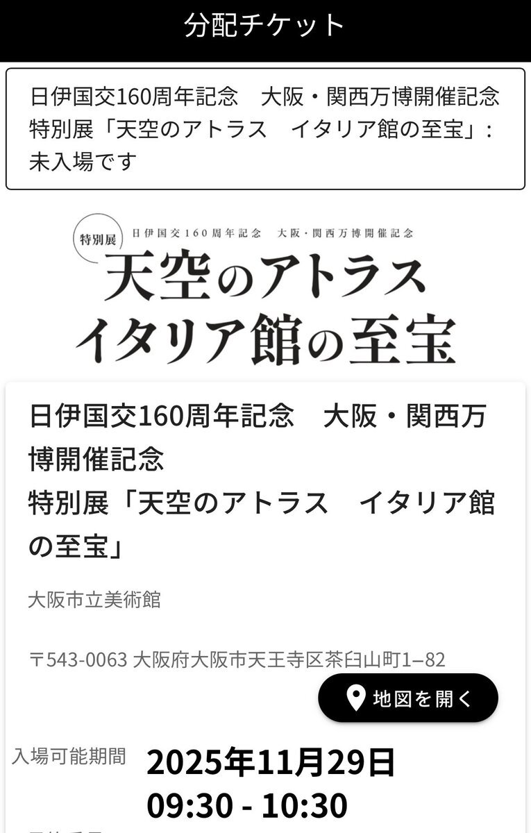 急遽行けなくなってしまい、お譲り先探しております。ご興味ある方DMくださいませ。 【譲】 大阪市立美術館 日伊国交160周年記念 大阪・関西万博開催記念 特別展 天空のアトラス イタリア館の至宝 11/30(日)10時半〜11時半 2枚 【求】 チケット代