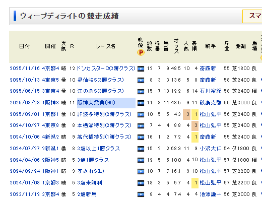ウィープディライトの戦績は アダム・ダン度がたかくてすきよ 夏は好きではなさそうwはやくオープン馬とかになってレース選べる立場になってね😉 条件戦を卒業……OP到達できたらノリさん乗ってくれないかな、馬の気分を利用したレース技術でワンチャンかましてくれる気がする