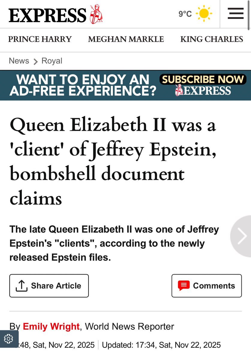 速報:新たに公開されたエプスタイン文 書によると、故エリザベス2世女王はジェフ リー・エプスタインの顧客の一人だった x.com/real_shirelass…